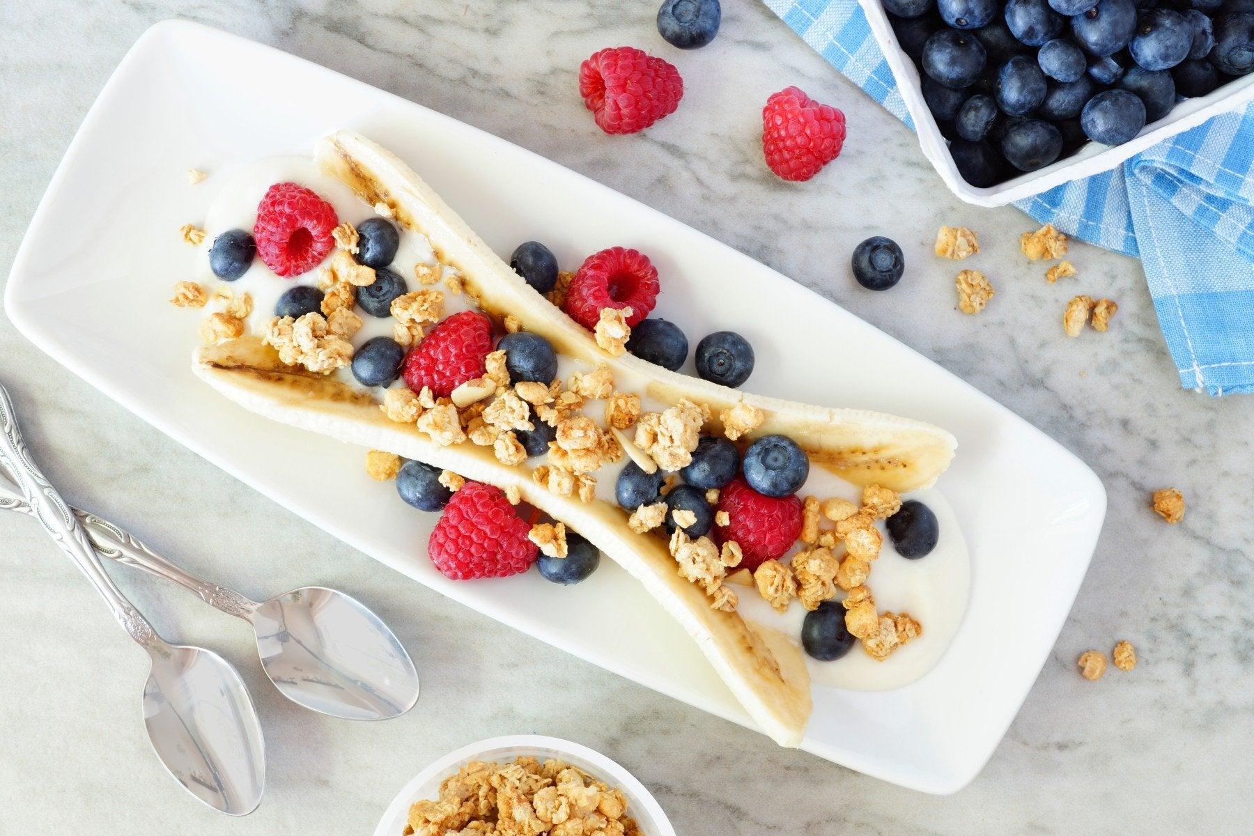 Schneide die Banane einfach der Länge nach in zwei Hälften und fülle sie mit griechischem Joghurt, frischem Obst (wir lieben Himbeeren!) und Nüssen.