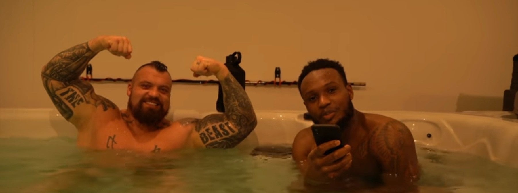 Eddie Hall und Viddal Riley haben kürzlich einige Zeit im Ring verbracht und gemeinsam Sparring betrieben. Während einer verdienten Auszeit haben sie sich in den Whirlpool gesetzt, und wir dachten uns, warum nicht ein paar Fragen stellen? Das ist wahrscheinlich der bequemste Ort, um eine Frage- und Antwortrunde durchzuführen. Und Eddie fühlte sich ganz wie zu Hause.