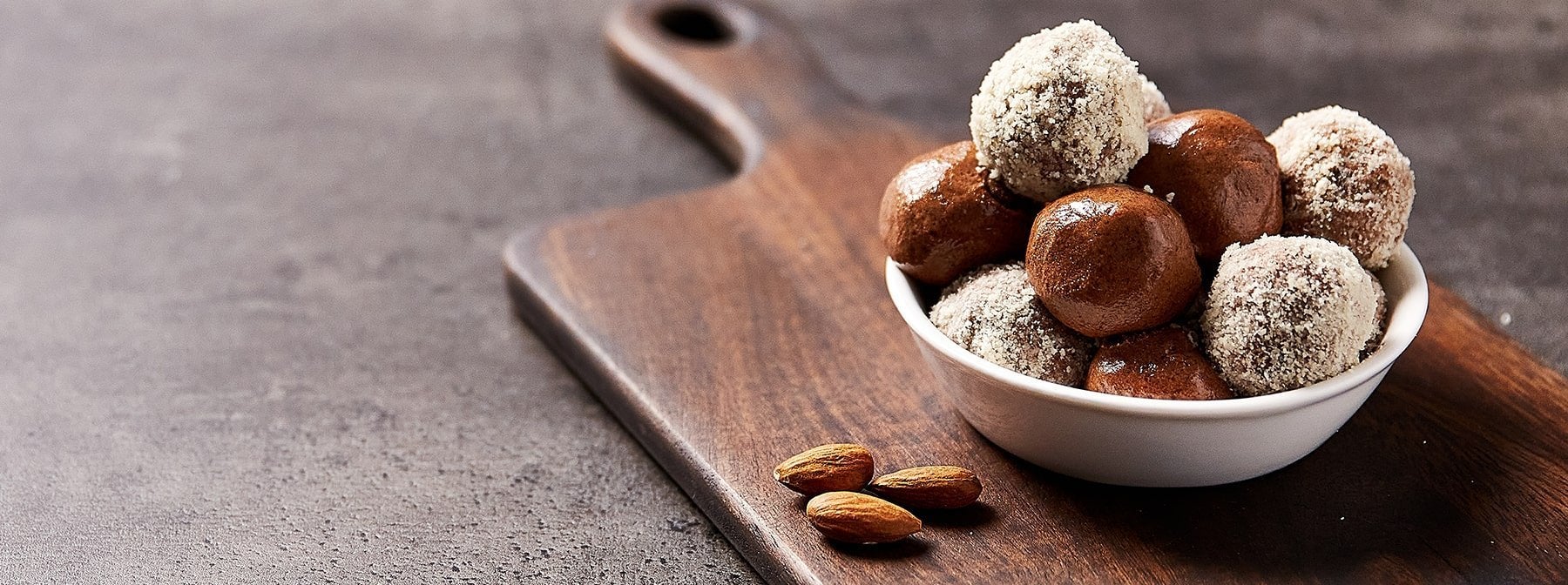 - Rolle nun jede einzelne Kugel in den gemahlenen Mandeln (prinzipiell ist jede Art von gehackten Nüsse dafür geeignet!) und genieße sie sofort (oder bewahre sie für später im Kühlschrank auf).
