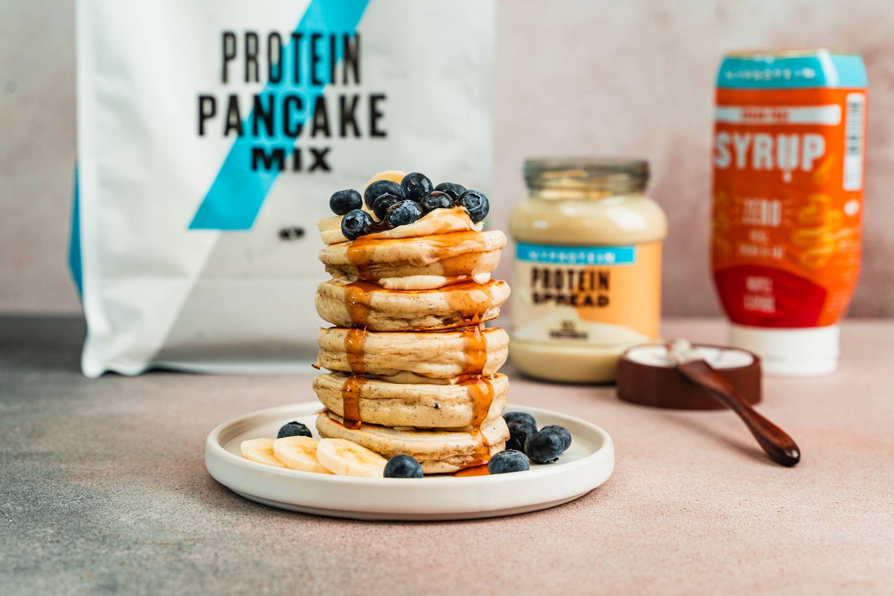Zum Schluss mit dem Protein-Aufstrich, dem zuckerfreien Sirup und frischem Obst (z.B. Bananen, Blaubeeren) garnieren – fertig!