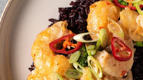 Knusprige Sriracha-Garnelen mit schwarzem Reis