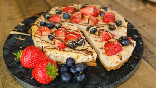 - Backe den cremigen Protein Käsekuchen mit Beeren bei 160°C Umluft für ca. 25 Minuten.