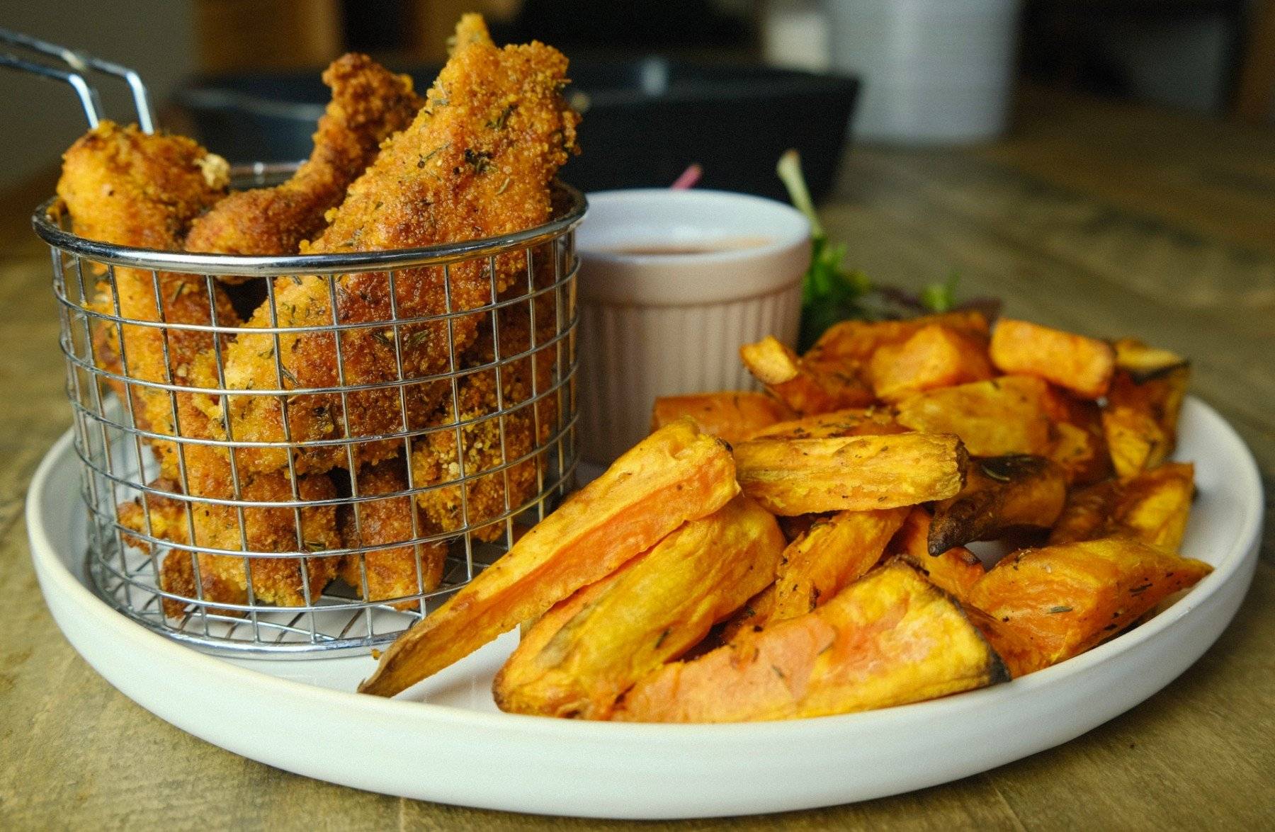 Serviere dein Crispy Chicken mit Süßkartoffel-Wedges zusammen mit einem gemischten Salat und reichlich zuckerfreier Sauce als Dip. Wähle zwischen BBQ, Peri Peri, Sweet Chilli und Tomaten-Ketchup - denn wir haben sie alle!