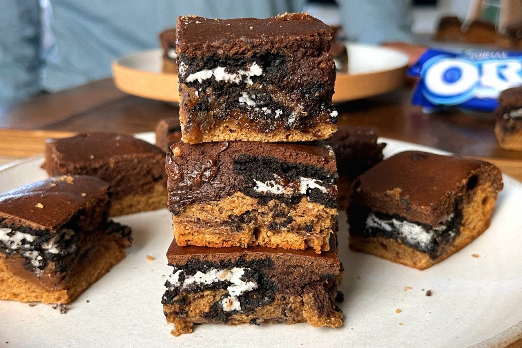 Den Keksteigboden aus dem Kühlschrank nehmen und die sechs Oreo-Kekse gleichmäßig darauf verteilen. Dann die Brownie-Mischung einfüllen und gleichmäßig auf der Oberfläche verteilen.