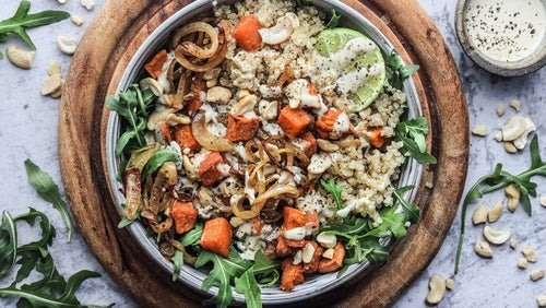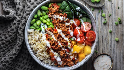 Probiere diese nahrhafte und unglaublich köstliche Bowl mit veganem Tofu-"Hack"....