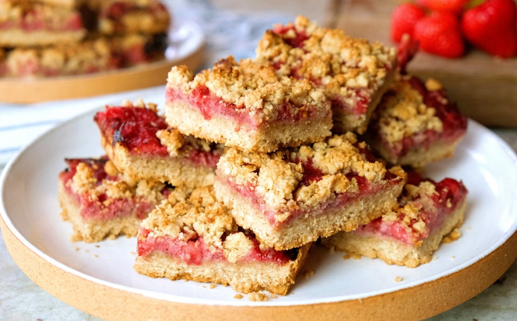 Die Erdbeersoße gleichmäßig auf dem Streuselboden verteilen und dann mit der reservierten Streuselmischung bedecken. 30-35 Minuten backen, bis die Streusel auf der Oberseite beginnen, golden zu werden.