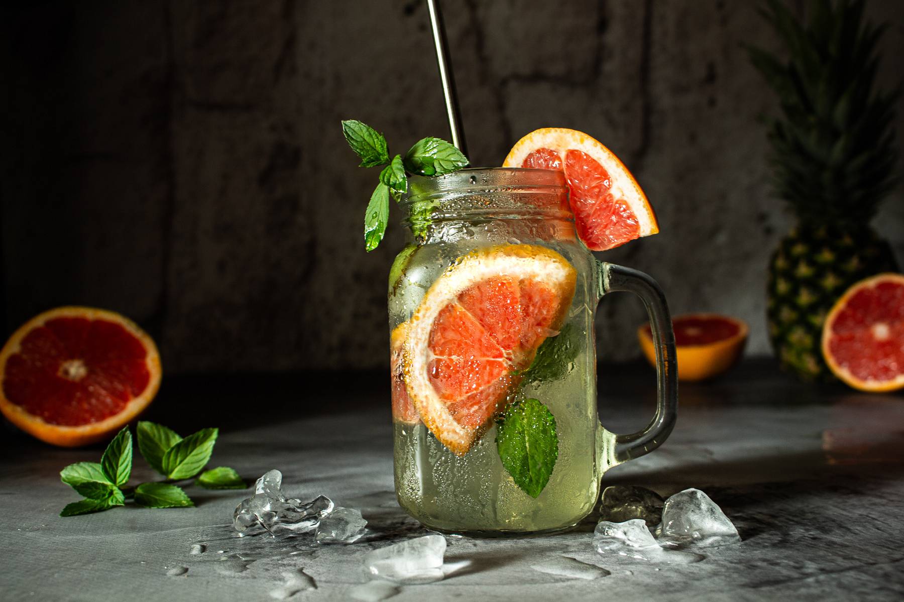 Bereite dir deine Protein Limonade mit wenigen Handgriffen zu und veredle sie mit frischen Früchten deiner Wahl. Wir haben uns beispielsweise für Grapefruit, Ananas und Minze entschlossen, aber selbstverständlich steht es dir frei, selbst ein wenig kreativ zu werden.