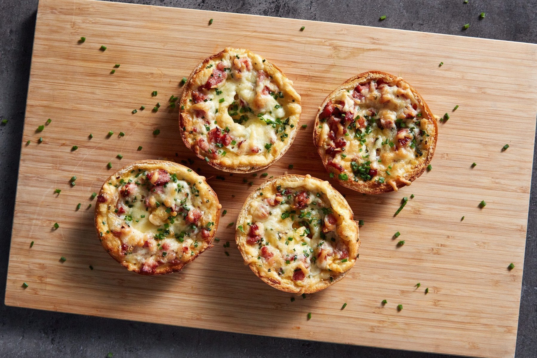 Belege jeden Bagel mit reichlich geriebenem Cheddar und etwas Schnittlauch und lasse ihn 10 Minuten lang backen. Lasse die Frühstücks-Bagels anschließend ein paar Minuten abkühlen, bevor du sie genießt – aber Vorsicht vor dem heißen Käse!