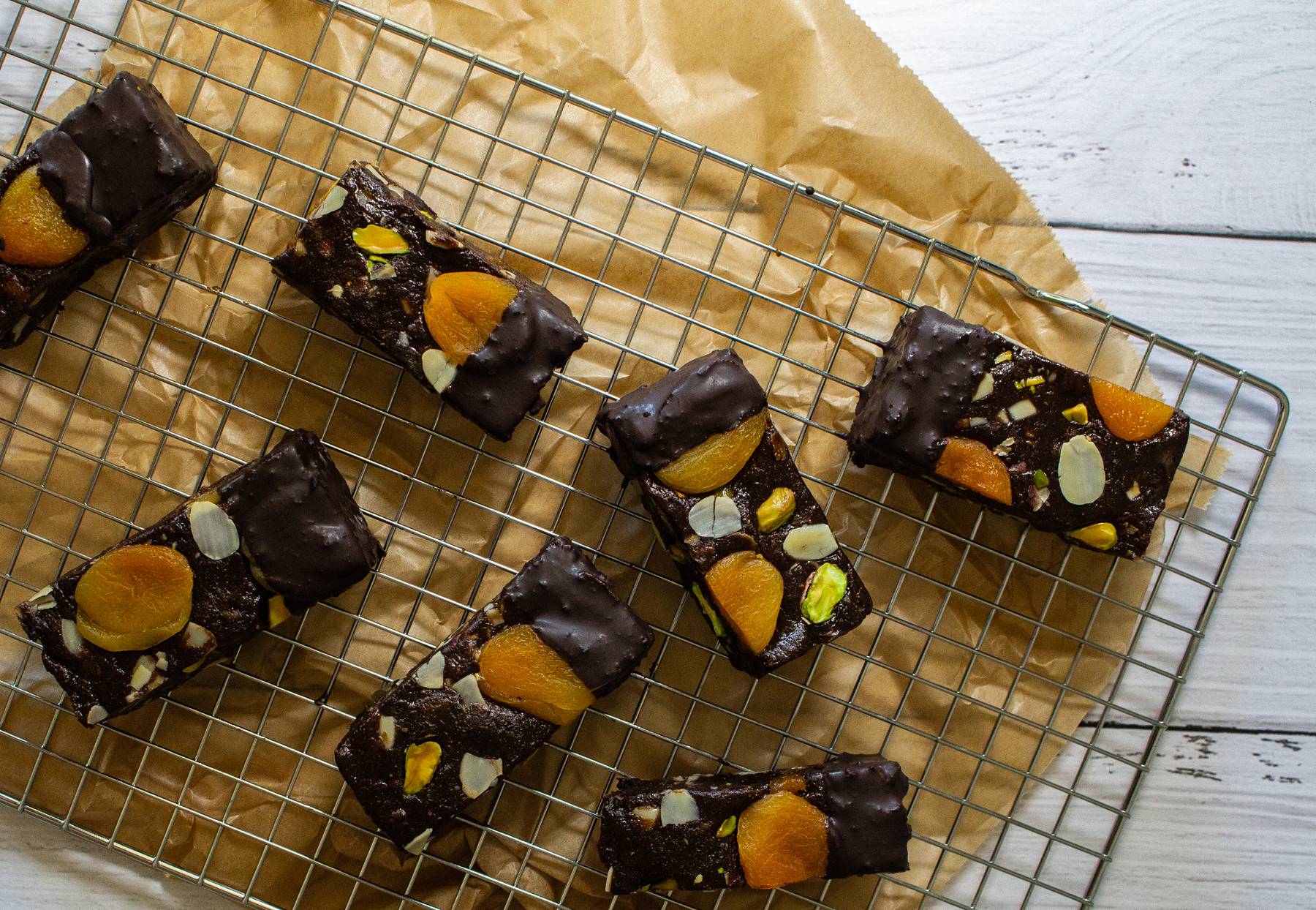 - Schmelze die Schokolade in der Mikrowelle. Schneide den Teig in 8 gleich große Riegel und tunke die Enden in die Schokolade. Lasse die Riegel abkühlen. Fertig!
