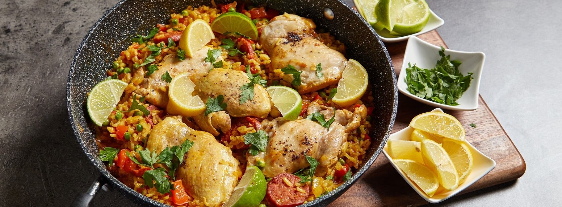 Die Hähnchenschenkel in die Pfanne geben und in den natürlichen Ölen der Chorizo braten. Mit Salz und Pfeffer würzen und durchgaren, bis sie auf jeder Seite gebräunt und nicht mehr rosa sind. Aus der Pfanne nehmen und ebenfalls beiseite stellen.