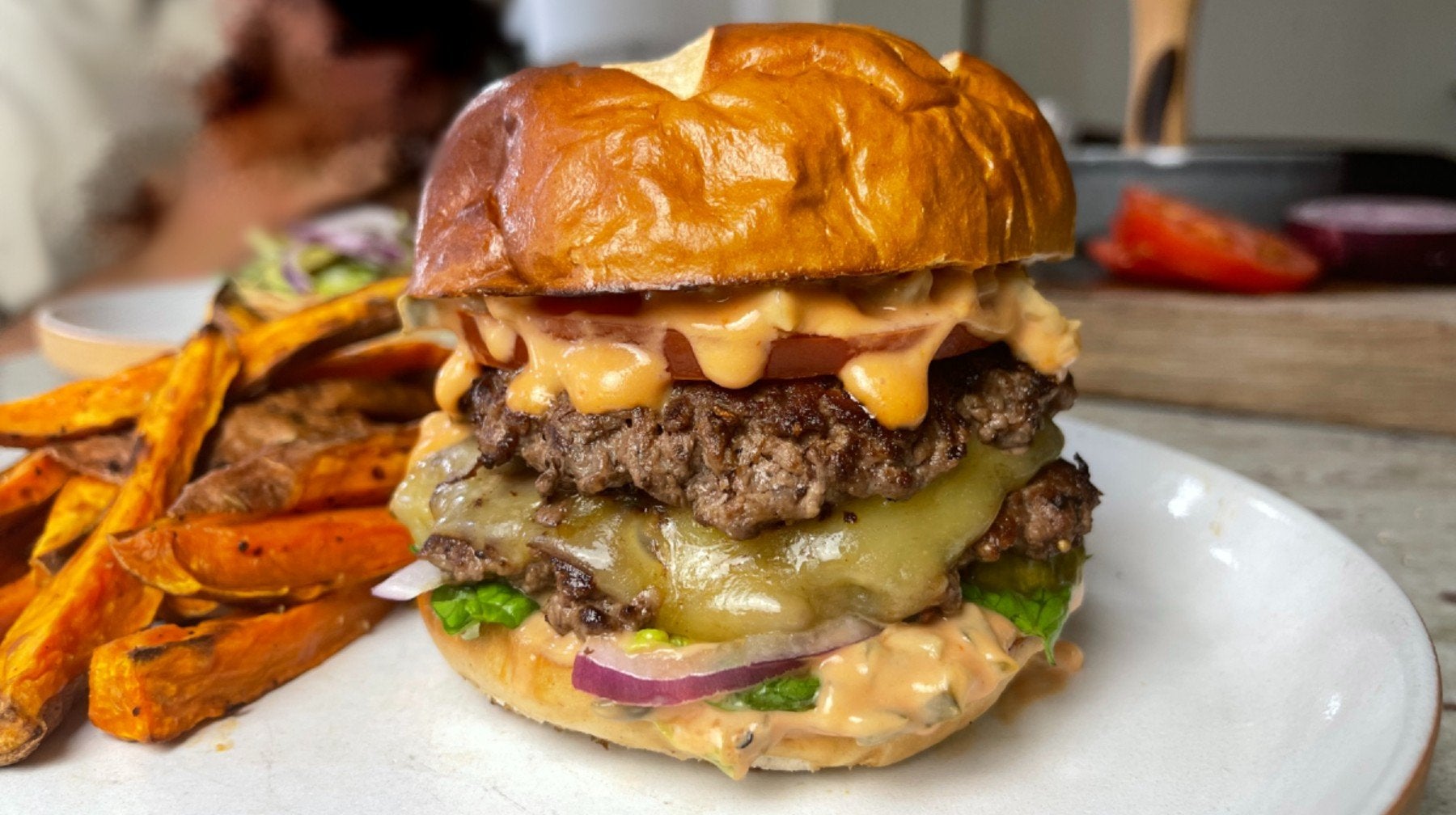 Eine Monterey-Jack-Scheibe auf eine Frikadelle legen, dann die andere Frikadelle darauf legen. Sobald der Käse geschmolzen ist, vom Herd nehmen und auf das vorbereitete Burgerbrötchen legen. Wiederhole diesen Vorgang für die restlichen Rindfleischpatties (und den zweiten Burger).