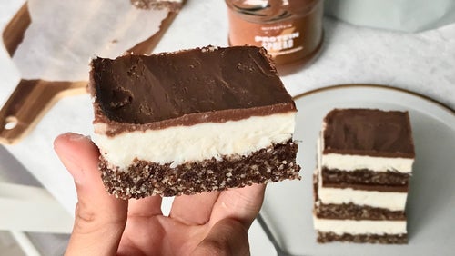 Mit Schokolade überzogene Kokosnuss Protein Schnitten