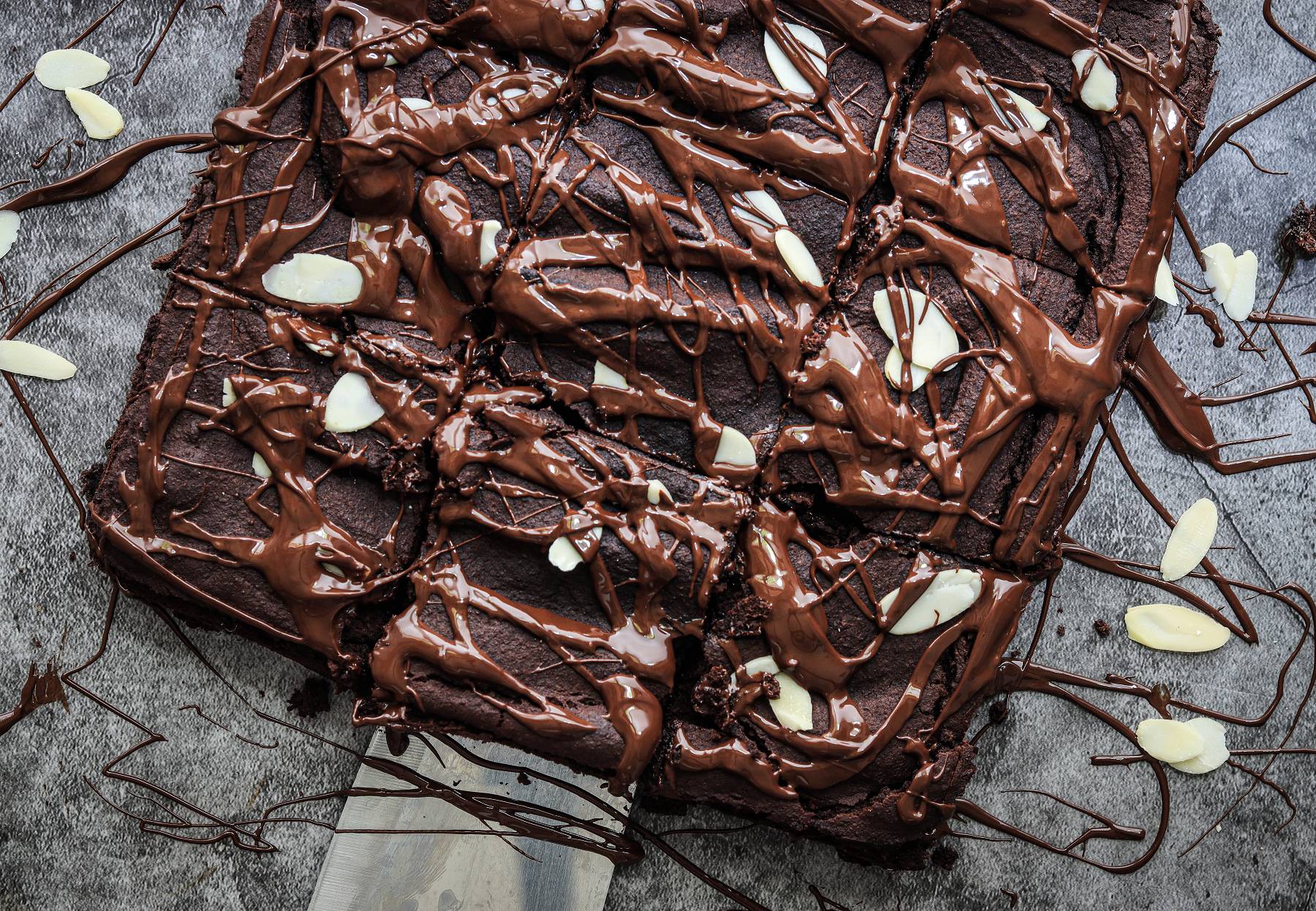 Gib die geschmolzene Schokolade auf den Teig und verteile abschließend ein paar Mandelplättchen darauf.