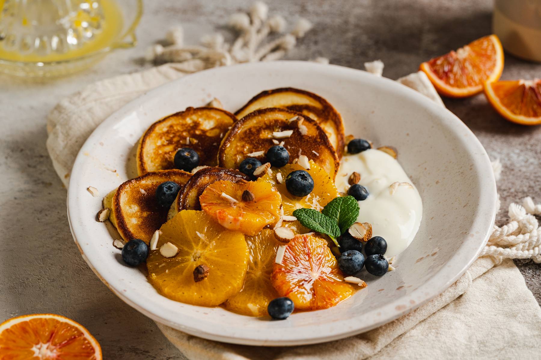 Köstliche Ricotta Protein Pancakes mit Orangen