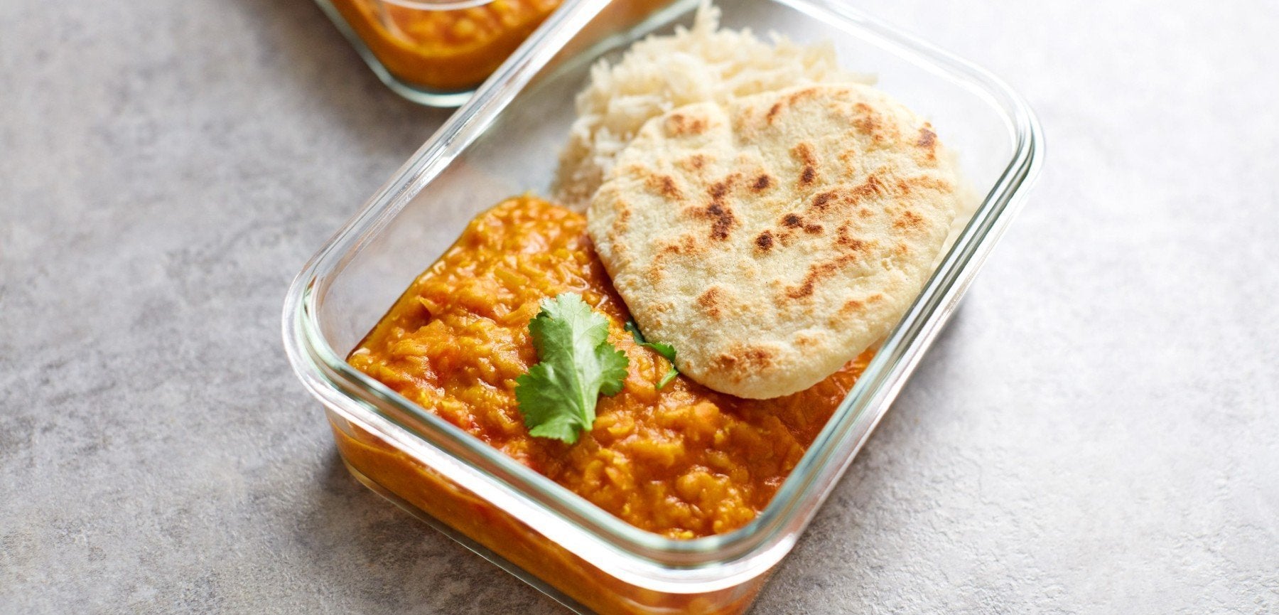 - Wenn dein Linsen-Dahl Eintopf gekocht ist, noch einmal gut umrühren und dann zusammen mit Reis in Behälter für deine Meal Prep portionieren. Füge jedem Behälter ein Mini-Naan hinzu und garniere zum Abschluss mit frischem Koriander.