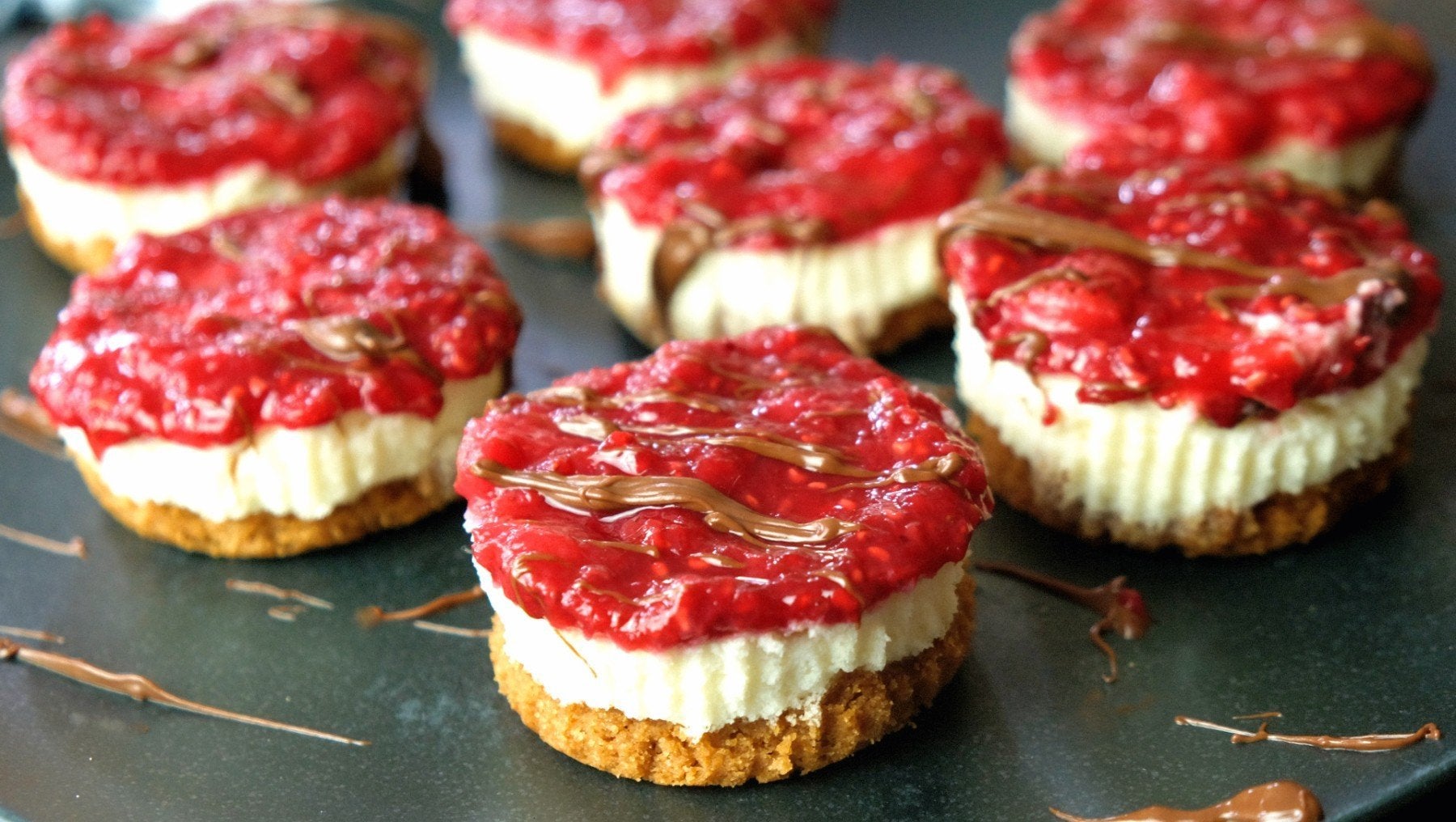Hole die Mini Käsekuchen aus dem Ofen und bestreiche sie mit Beerenmarmelade. Jetzt noch mit dem geschmolzenem Protein-Aufstrich dekorieren. In den Kühlschrank stellen und mindestens 1 Stunde lang abkühlen lassen, dann genießen!