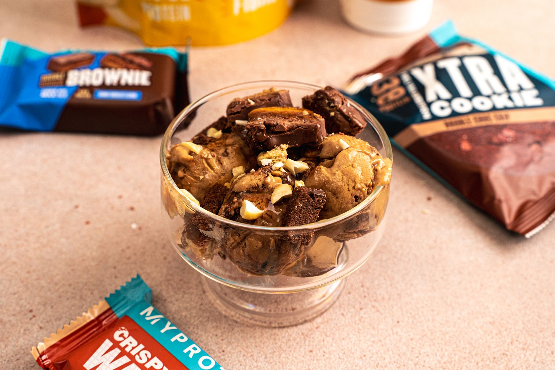 Serviere das Protein-Eis zusammen mit deinen Lieblingstoppings (wir haben uns für einen Wafer, Brownie, Cashewnüsse und zuckerfreien Sirup entschieden).
