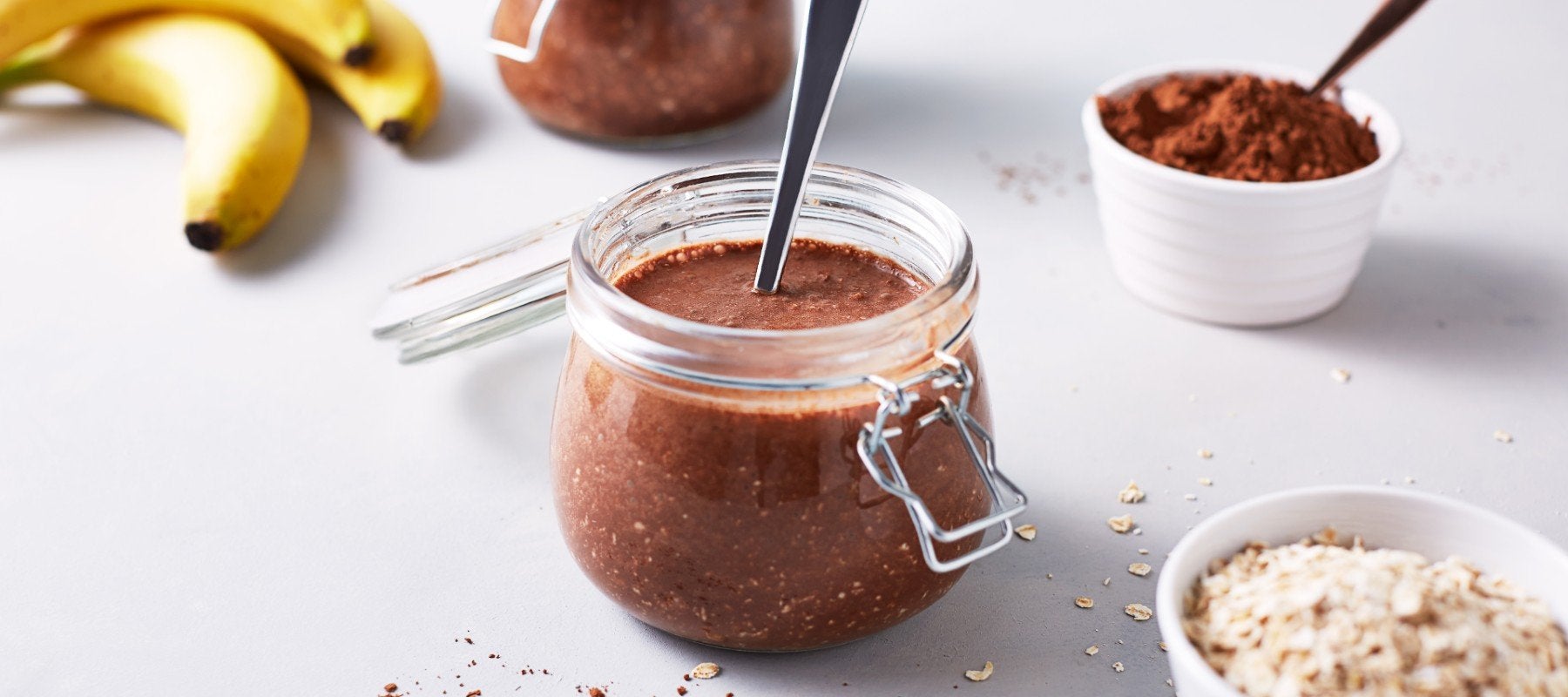 Mische alle Zutaten, außer die Haferflocken, bis du eine cremige Masse hast.