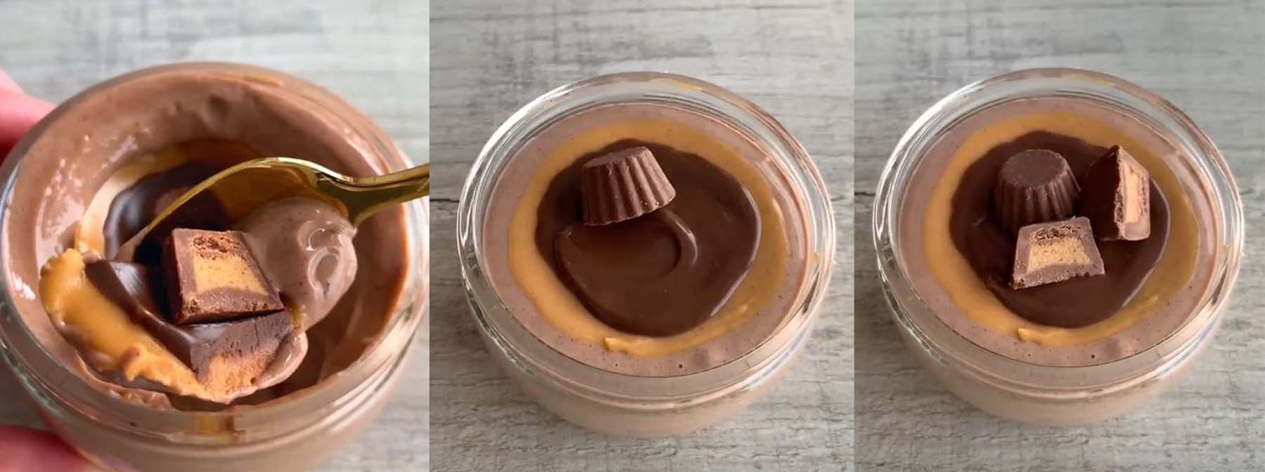Füge zum Schluss die 2 Mini Peanut Butter Cups hinzu (sofern du magst), um dem Dessert den abschließenden, köstlichen Touch zu verleihen und gönne es dir entweder sofort oder stelle es in den Kühlschrank für später.