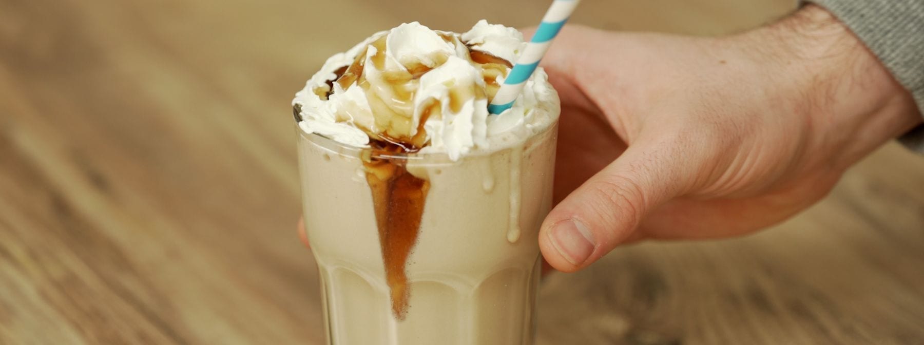 - Serviere den Protein Eiskaffee Shake in einem hohen Glas, garniere ihn mit Schlagsahne und gib noch ein paar Spritzer Butterscotch Sirup drüber.