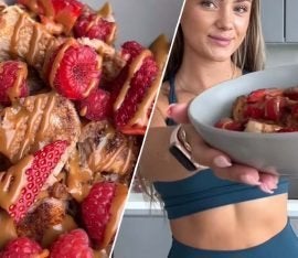 Auf einen Teller geben und mit Beeren und zuckerfreiem Sirup (Karamell) garnieren.