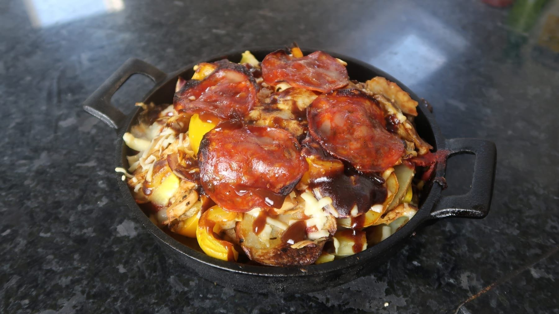 - Wiederhole das Ganze und schließe mit einer Ladung BBQ Sauce und Pepperonischeiben ab.