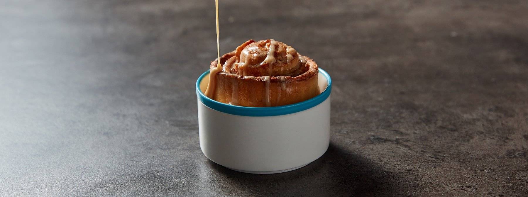 Das Zimtröllchen in eine kleine, ofenfeste Auflaufform oder einen Becher legen und 15-20 Minuten backen, bis es goldbraun und durchgebacken ist.