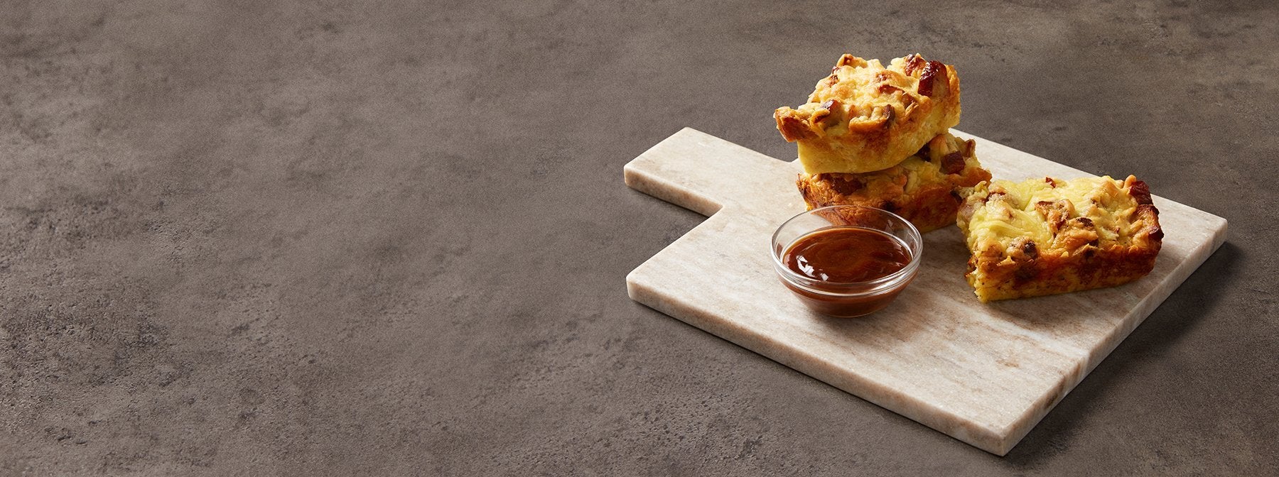 Die Wurststücke darauf verteilen, dann die verquirlten Eier darüber gießen.