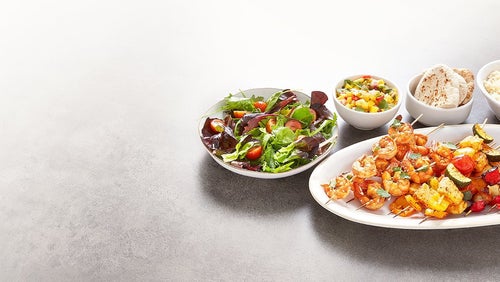 Sriracha-Garnelen, Honig-Knoblauch-Hähnchen und Gemüse-Halloumi-Spieße. Hier ist für jeden etwas dabei. Sie machen sich auf jedem Teller gut, ganz egal, wie viel schon drauf liegt.
