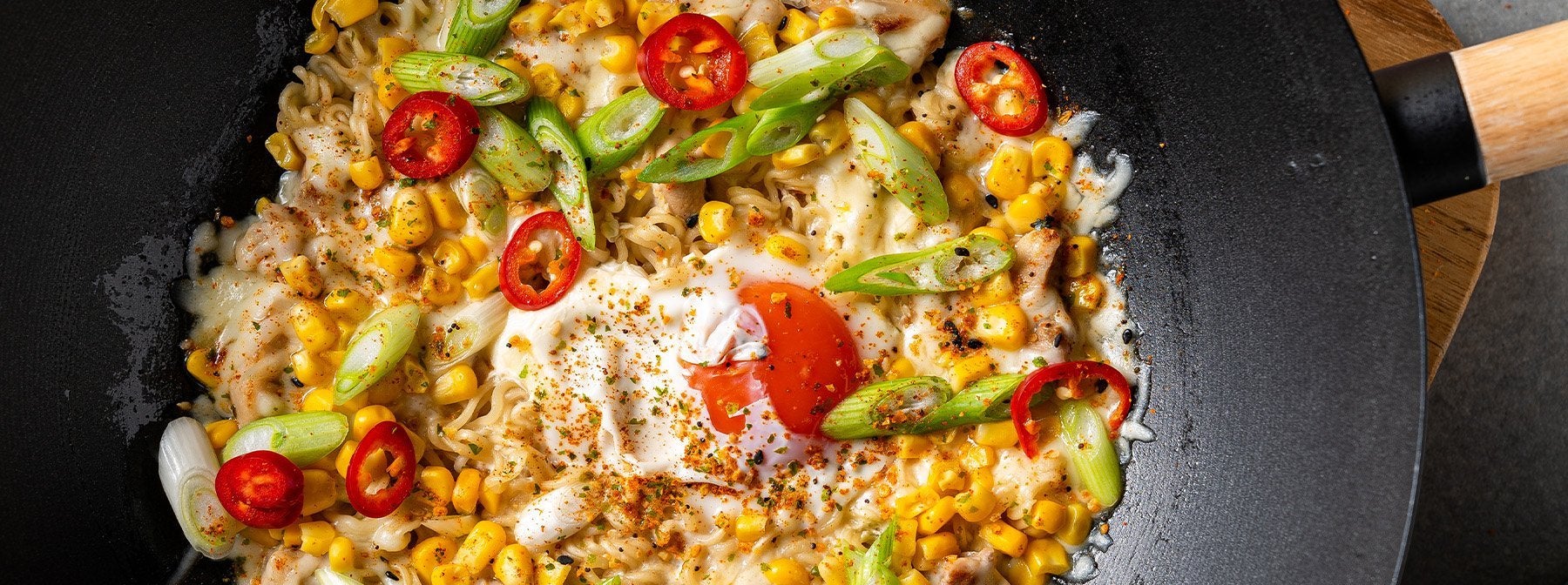 Schlage ein Ei in der Mitte der Nudeln auf und gib noch etwas geriebenen Käse, gehackte Frühlingszwiebel, Mais und ein paar Scheiben von der Chilischote hinein.