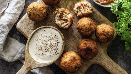 Vegane gefüllte Risottobällchen mit rotem Pesto & Käse