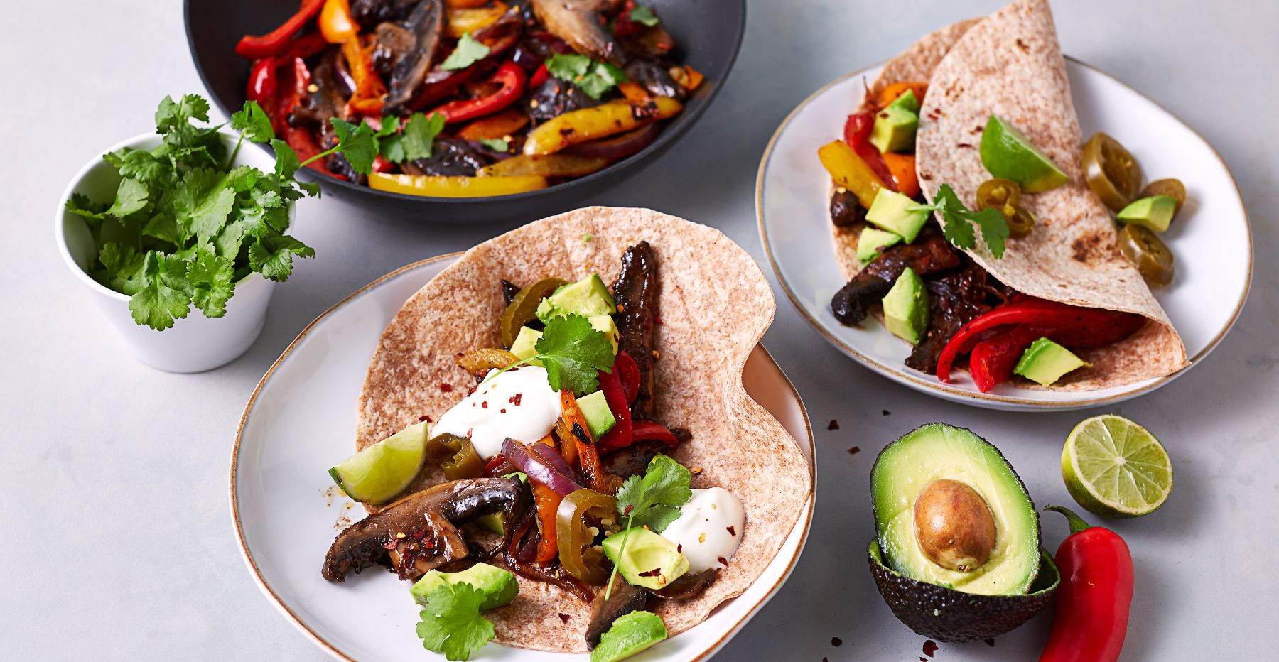 Sobald der Pfanneninhalt braun geworden ist, erwärmst du die Tortillas im Ofen oder in der Mikrowelle. Die Tortillas füllst du dann mit dem Portobello-Fajita-Mix, den Jalapeños, der Guacamole und der Sauce.