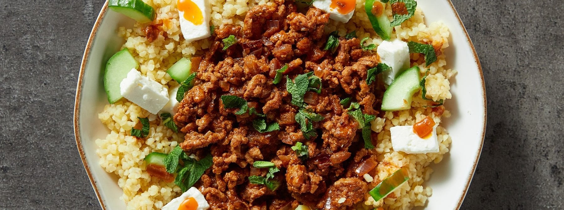 - Ein Bett aus Feta-Bulgur auf einem Teller anrichten und ein paar Löffel der Lammfleischmischung darauf geben. Mit ein paar frischen Minzblättern garnieren und servieren! Alternativ können Sie das Gericht auch in Behältern portionieren und bis zu 3 Tage im Kühlschrank aufbewahren.