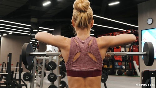 - Wähle eine mittelschwere Langhantel und stelle dich aufrecht hin. Du solltest die Stange hinter deinem Kopf halten, sodass deine Ellenbogen nach oben in Richtung Decke zeigen.